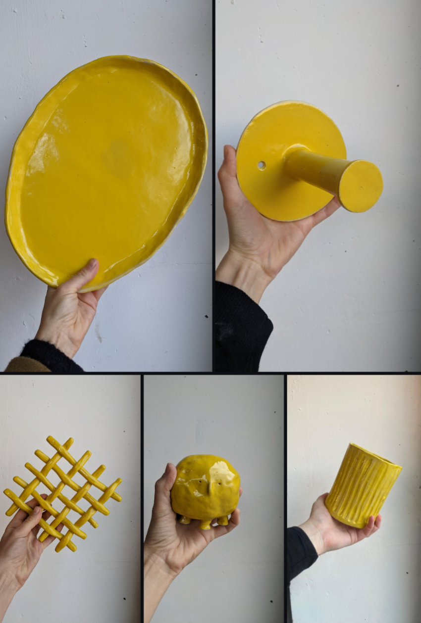 pièces réalisées par des élèves au tabouret, émail jaune citron
